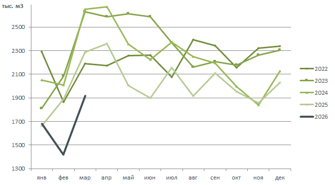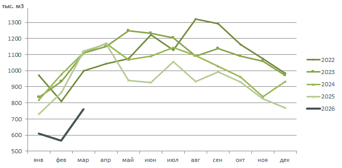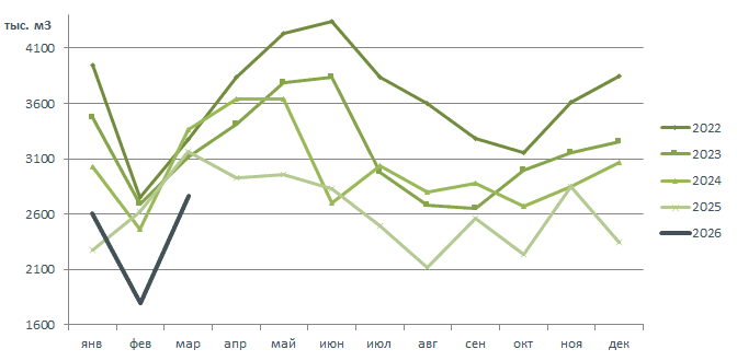 Динамика поставок древесины в Китай 2022-2026.03